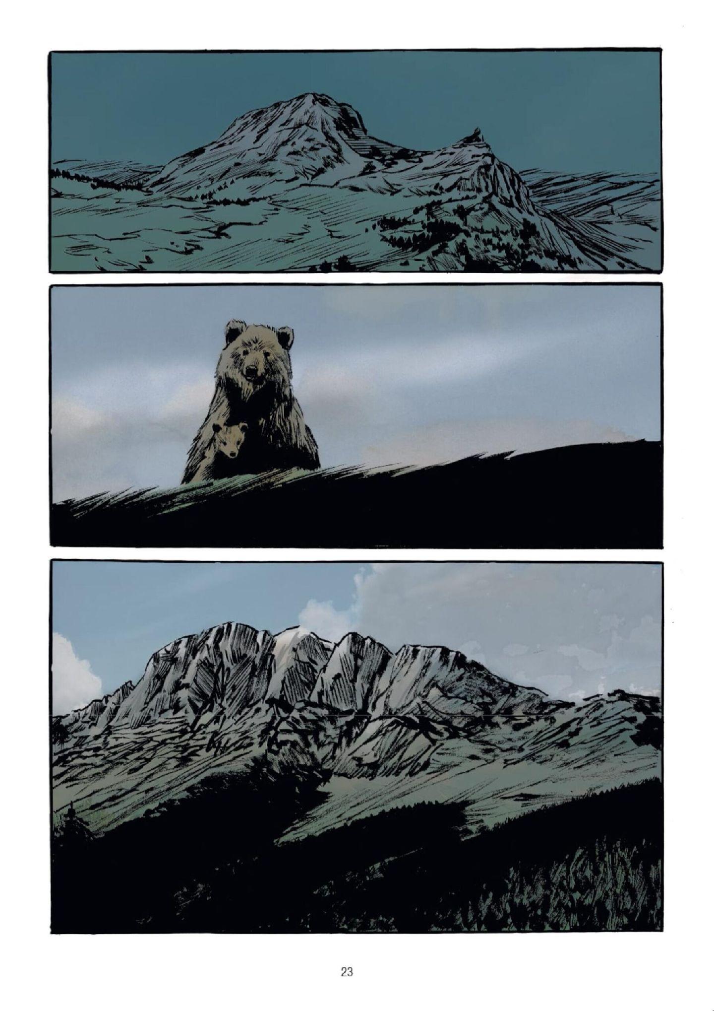 Je l’ai tout de suite repéré sur les étalages, cet ours perché sur un pic montagneux en première de couverture, et j’ai été emportée par cette BD. Les sentiments de sauvagerie, de grandeur, de noblesse et de beauté, nous envahissent totalement à la lecture des 238 pages, tant dans les dessins que dans les actions et les paroles des personnages.